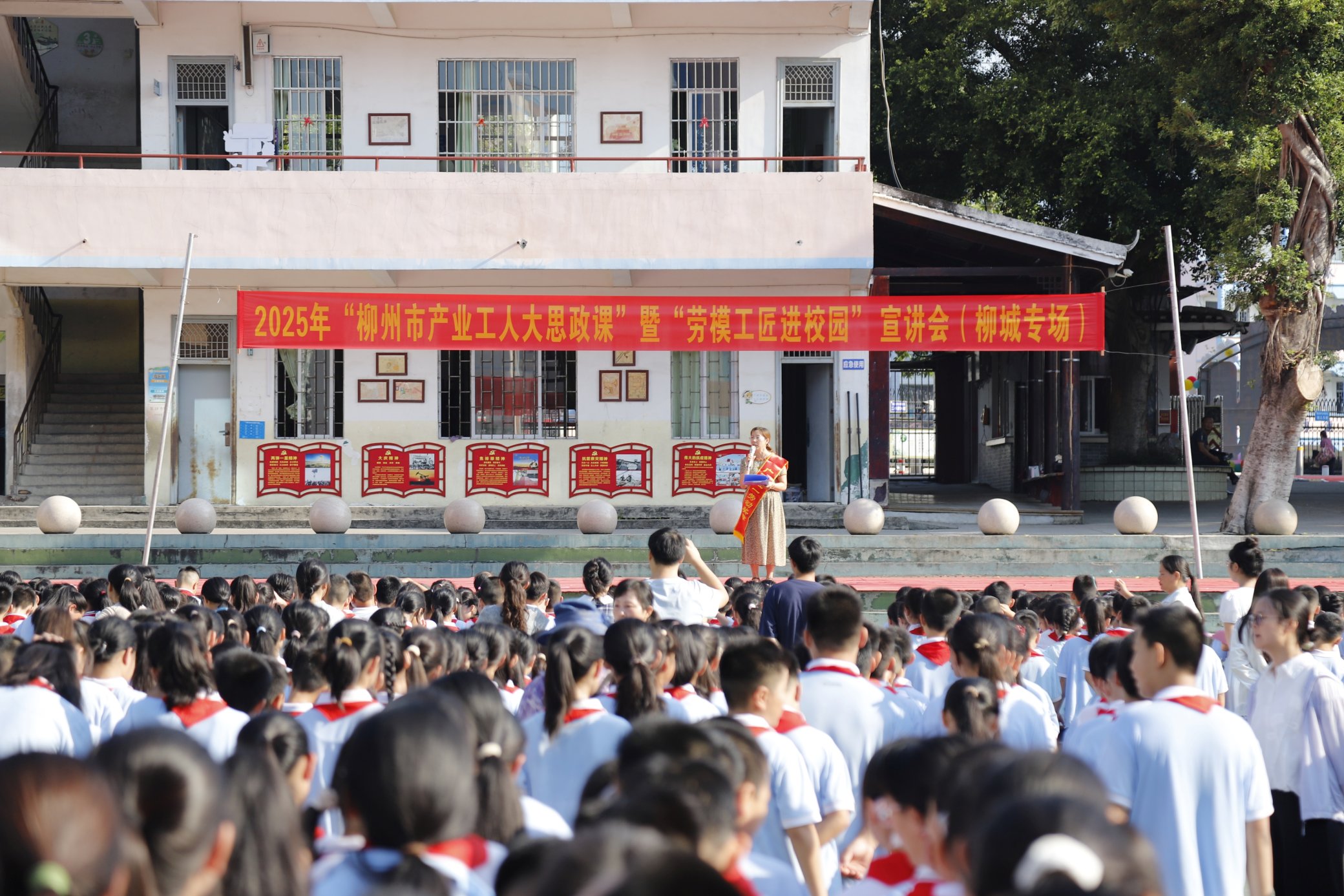2025年9月1日,柳城县实验小学操场上红旗飘扬,全校师生齐聚一堂,举行以“秋火记忆润童心,学子逐梦启新程”为主题的2025年秋学期开学典礼暨安全第一课。活动特别邀请到广西五一劳动奖章获得者黄秋莲,开展“柳州市产业工人大思政课”暨“劳模工匠进校园”宣讲,为师生们带来一堂深刻的爱国与成长教育课。