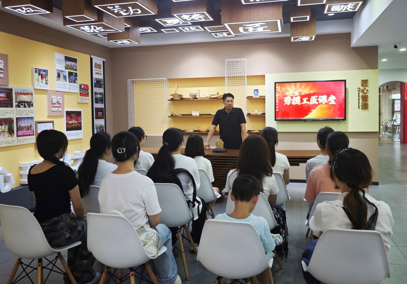 活动以参观劳模工匠展厅为开篇,通过一件件镌刻时光的展品、一段段感人至深的奋斗故事,开启了一场跨越时空的精神对话,让同学们在沉浸式体验中感悟“平凡何以成就非凡”的励志故事。劳模工匠课堂还特邀了鹿寨黄氏木雕“非遗”技艺传承人、“鹿寨工匠”黄成非,现场为大家讲解他在学习、从事木雕工艺创作20多年里对于工匠精神的理解,并展示普通木料经雕刻从原始到艺术的蜕变,为同学们提供了宝贵的启示和指导,鼓励同学们用扎实的专业功底和创新思维为未来蓄力。