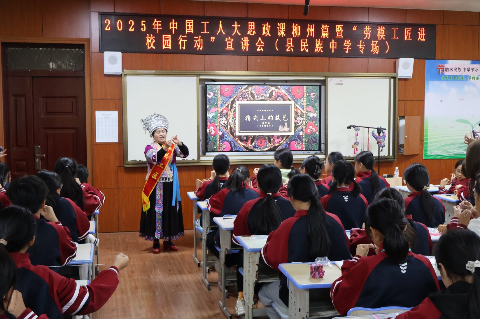 为大力弘扬劳模精神、劳动精神、工匠精神,引导学生们树立正确的世界观、人生观、劳动观,近日,2025年中国工人大思政课柳州篇暨“劳模工匠进校园行动”宣讲会先后走进融水苗族自治县思源实验中学与融水苗族自治县民族中学,特邀柳州工匠唐巧英现场宣讲。