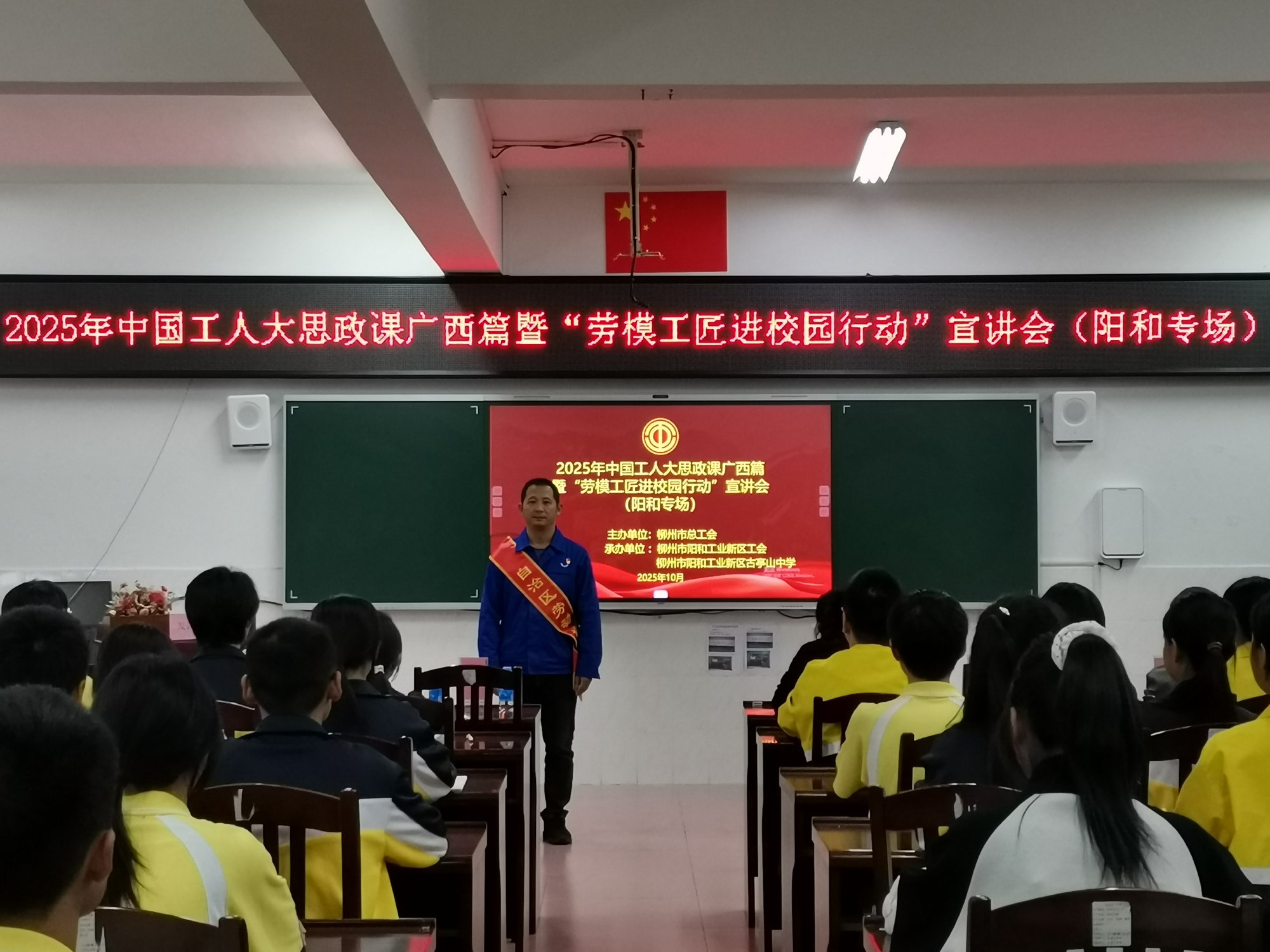 10月31日,柳州市阳和工业新区工会“劳模工匠进校园”宣讲活动走进阳和工业新区古亭山中学,该校百余名师生到场聆听。