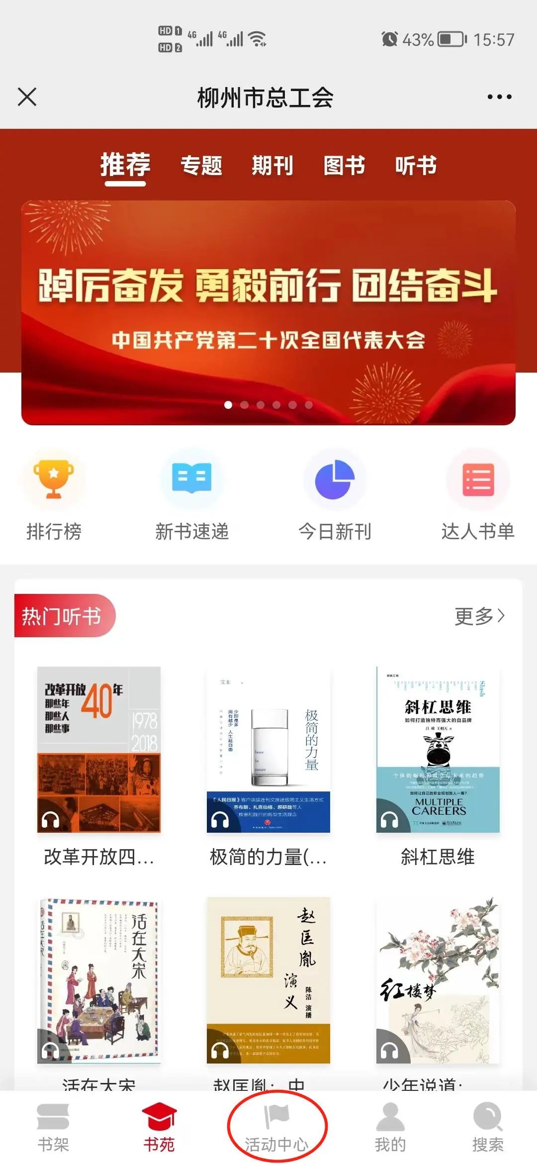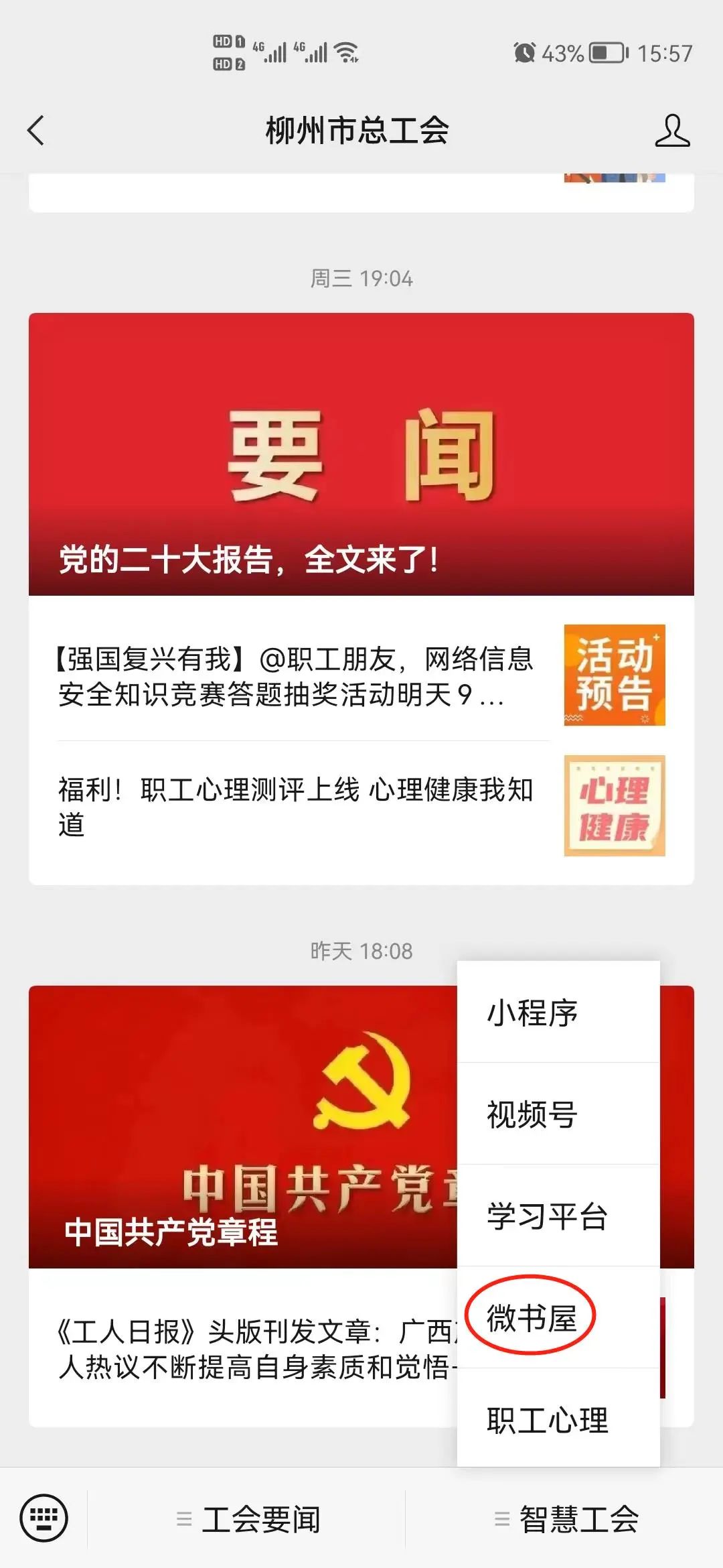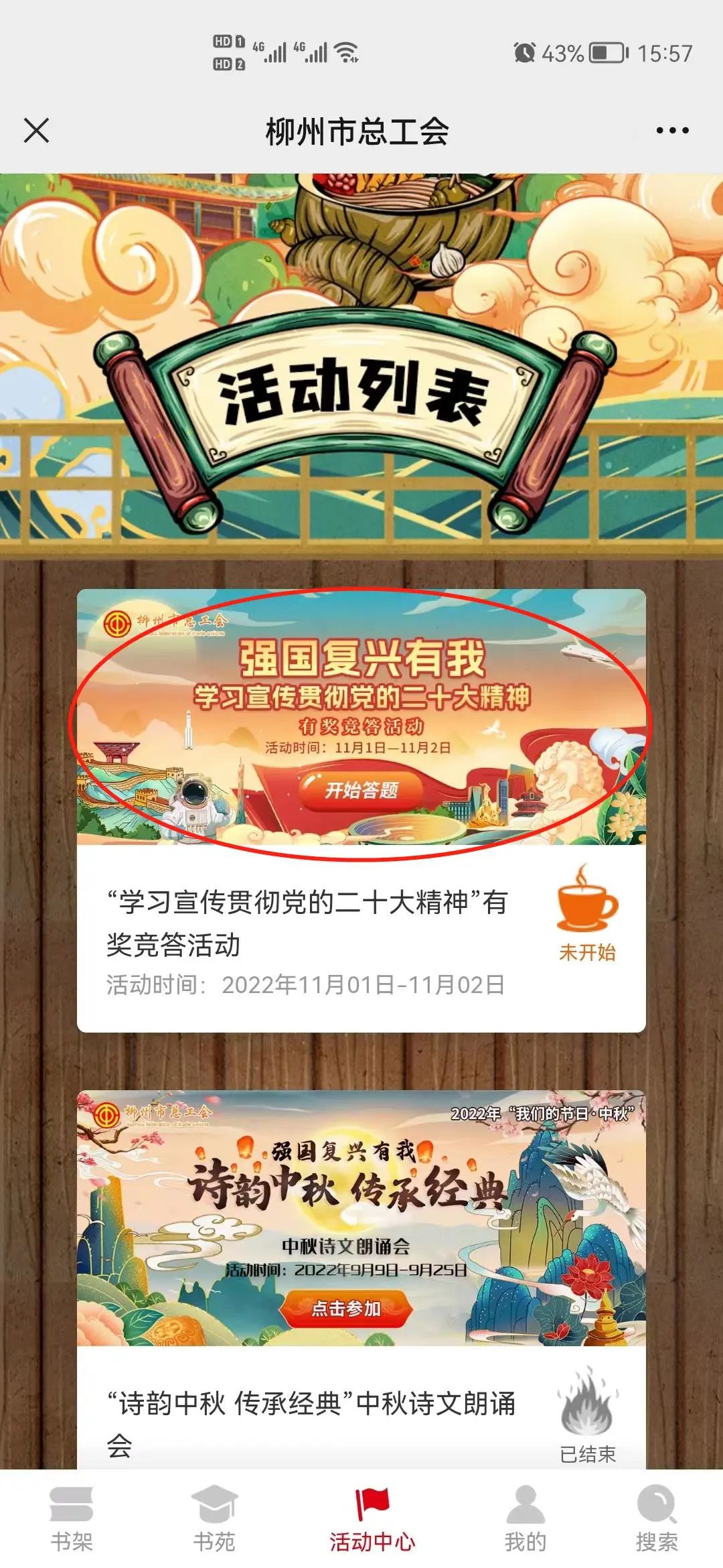 1.关注“万彩网”微信公众号,点击底部菜单栏“智慧工会”--“微书屋”,从书屋底部“活动中心”进入活动列表页面,点击宣传图进入活动主页参与线上答题。