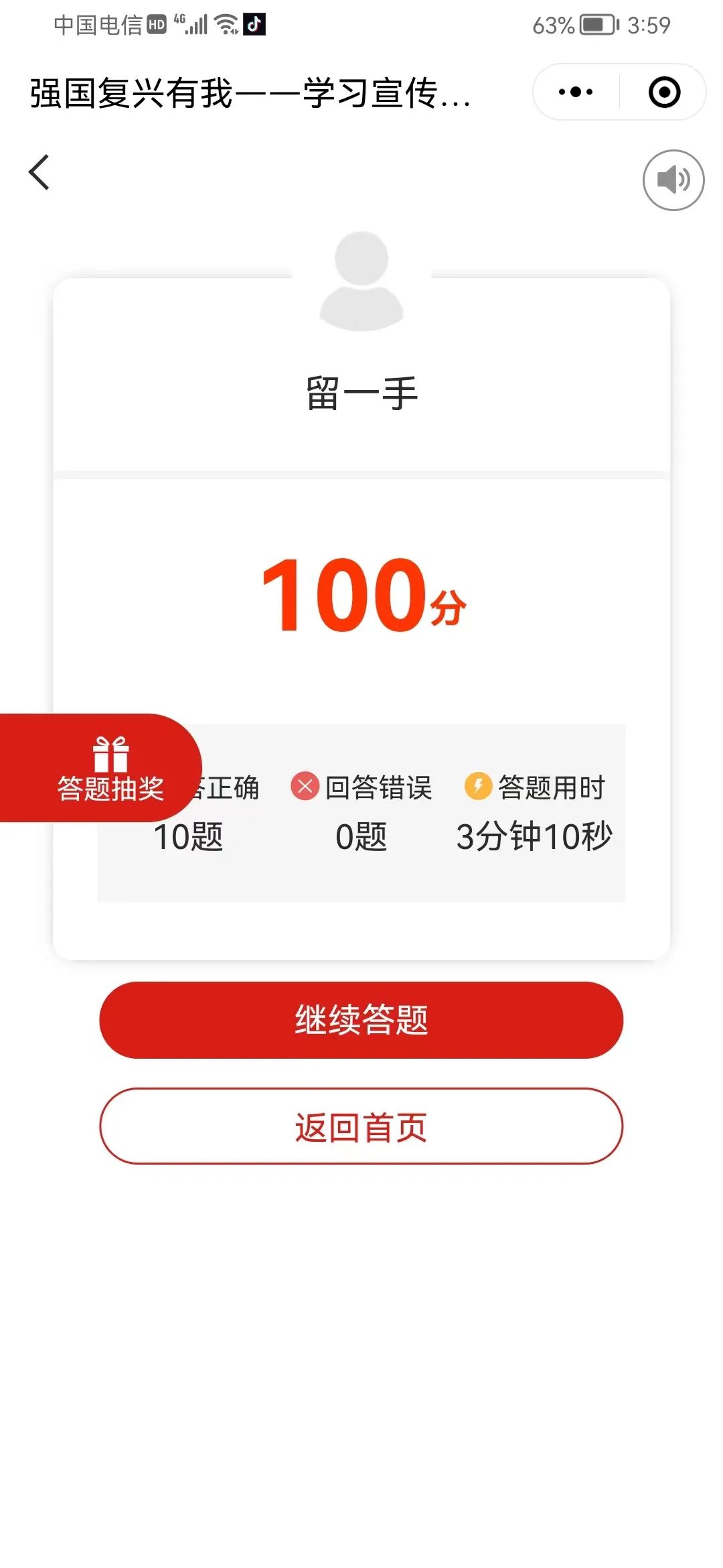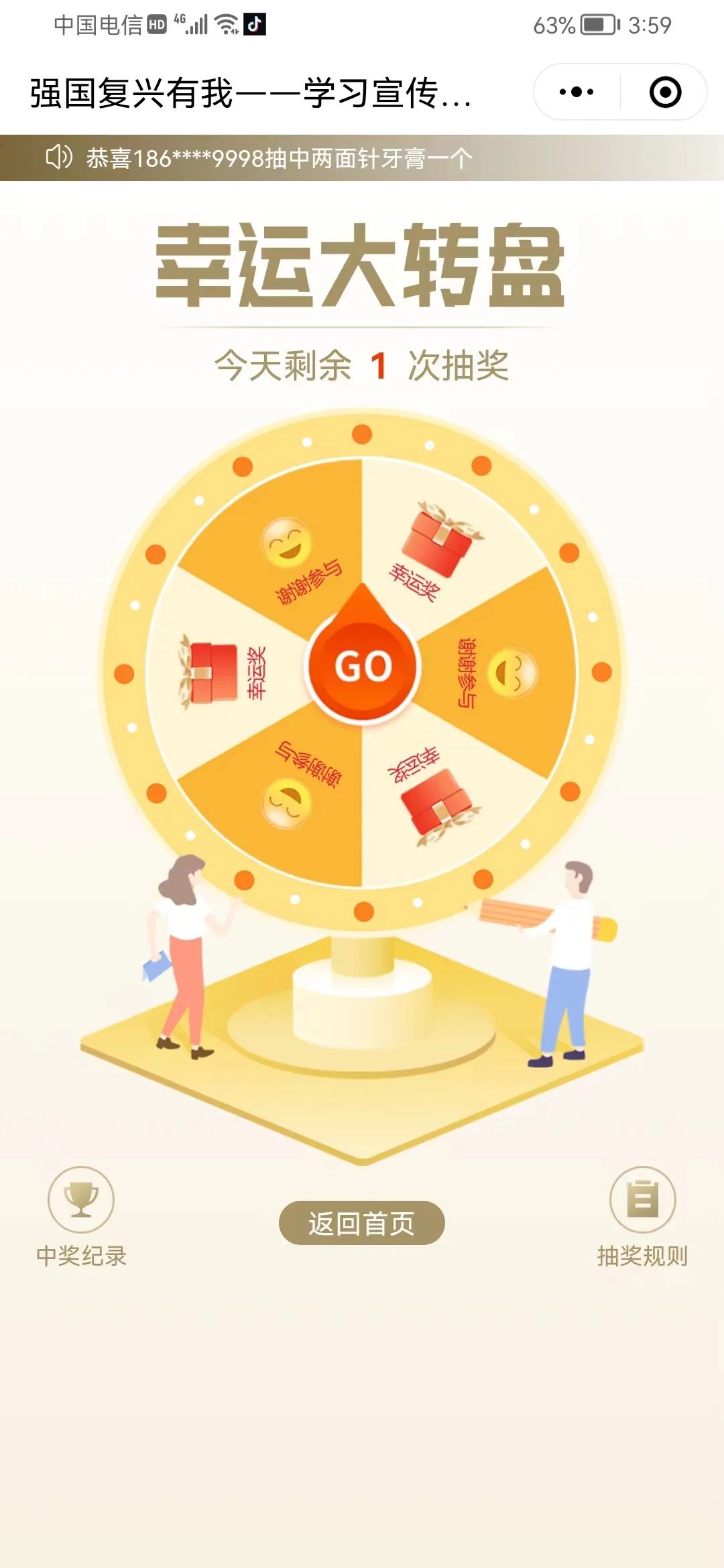 1.系统从题库中随机抽取10题进行组卷,全部答对即可参与幸运大转盘抽奖一次。