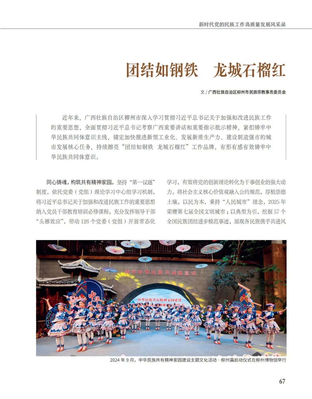 近日,《中国民族》杂志2025年第8期,以《团结如钢铁 龙城石榴红》为题,专题呈现柳州市铸牢中华民族共同体意识的实践经验。文章呈现柳州市锚定铸牢中华民族共同体意识主线、推动各民族“像石榴籽一样紧紧抱在一起”的工作成效。全文如下: