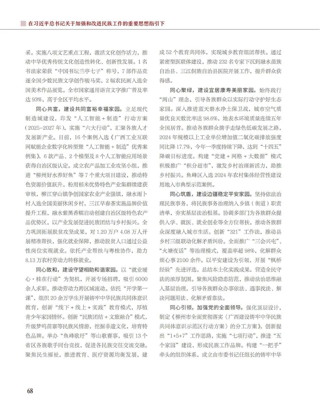 同心致和,建设守望相助和谐家园。 以“就业暖心·桂在行动”为契机,开展专场招聘,吸引 6000余人求职,推动劳动力跨区域流动。依托“开学第一课”,组织 20 余万学生开展铸牢中华民族共同体意识教育,创新“线下 + 线上 + 实践”教育模式,厚植青少年家国情怀。创新“民族团结 + 文旅融合”模式,升级梦呜苗寨等民族风情游,挖掘非遗文化,培育特色品牌。举办“鱼峰歌圩”等山歌赛事,吸引13 个省区各族歌手同台竞技,促进各民族交往交流交融。聚焦民生福祉,推进教育、医疗资源均衡发展,建成 52 个教育共同体,实现城乡教育组团帮扶。通过紧密型医联体建设,推动 232 名专家下沉到融水苗族自治县、三江侗族自治县医院开展工作,提升群众获得感。