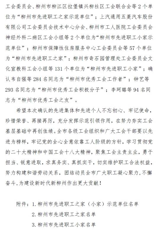 关于确认2023年度柳州市先进职工之家、 先进职工小家和柳州市优秀工会工作者、优秀工会积极分子、优秀工会之友结果的通报