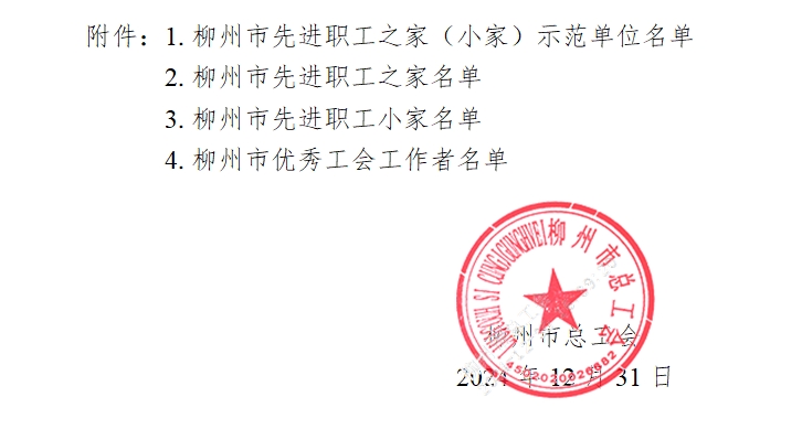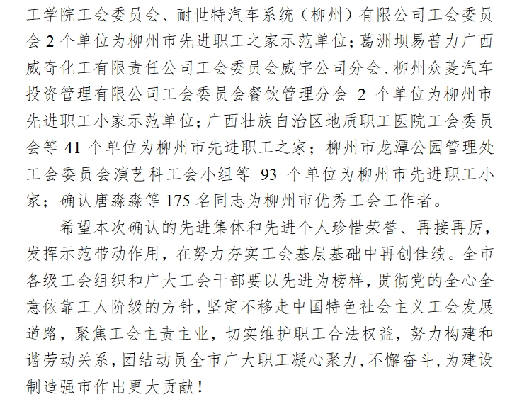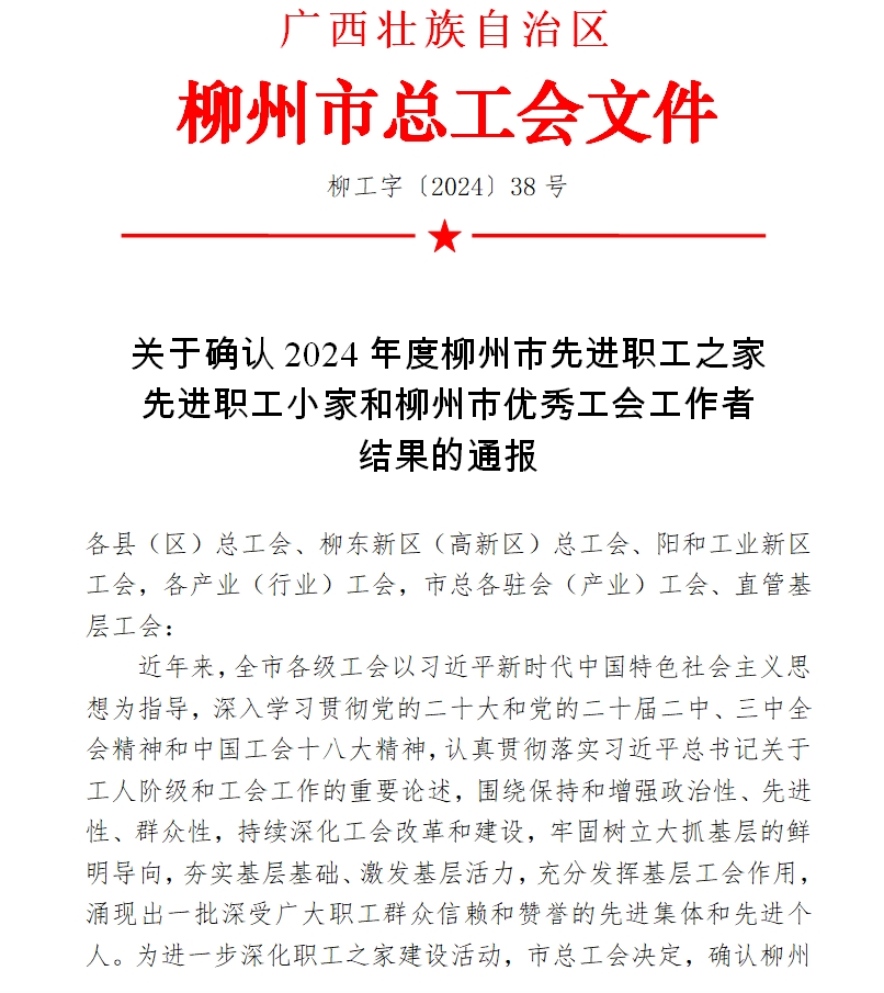 关于确认2024年度柳州市先进职工之家先进职工小家和柳州市优秀工会工作者结果的通报