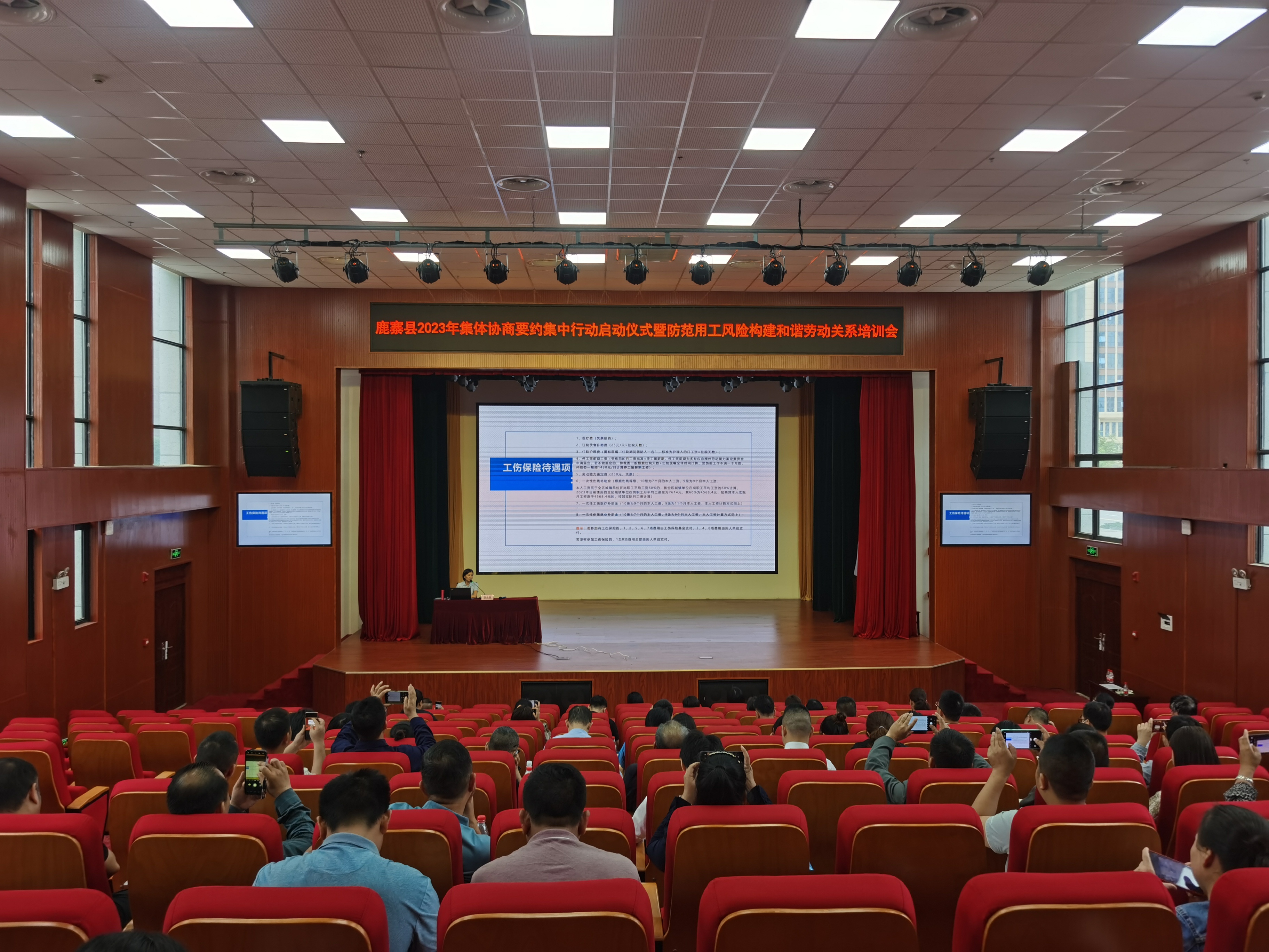 5月23日下午,鹿寨县2023年集体协商要约集中行动启动仪式暨防范用工风险构建和谐劳动关系培训会在鹿寨县总工会多功能报告厅举行,县人社局、县总工会、县科工贸局、县工商联三方四部门的分管领导,以及各乡镇(社区)工会主席、社会化工作者和县辖内企业负责人、工会主席共90余人参会。