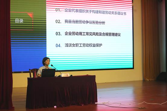 启动仪式后,鹿寨县劳动人事争议仲裁院院长覃永凤针对鹿寨县各企业现状以及当前劳动争议形势进行分析,给与会人员进行《防范用工风险构建和谐劳动关系》专题培训,培训内容充实丰富,生动具体,理论与案例有机结合,具有很强的指导性和针对性,获得与会人员的一致好评。
